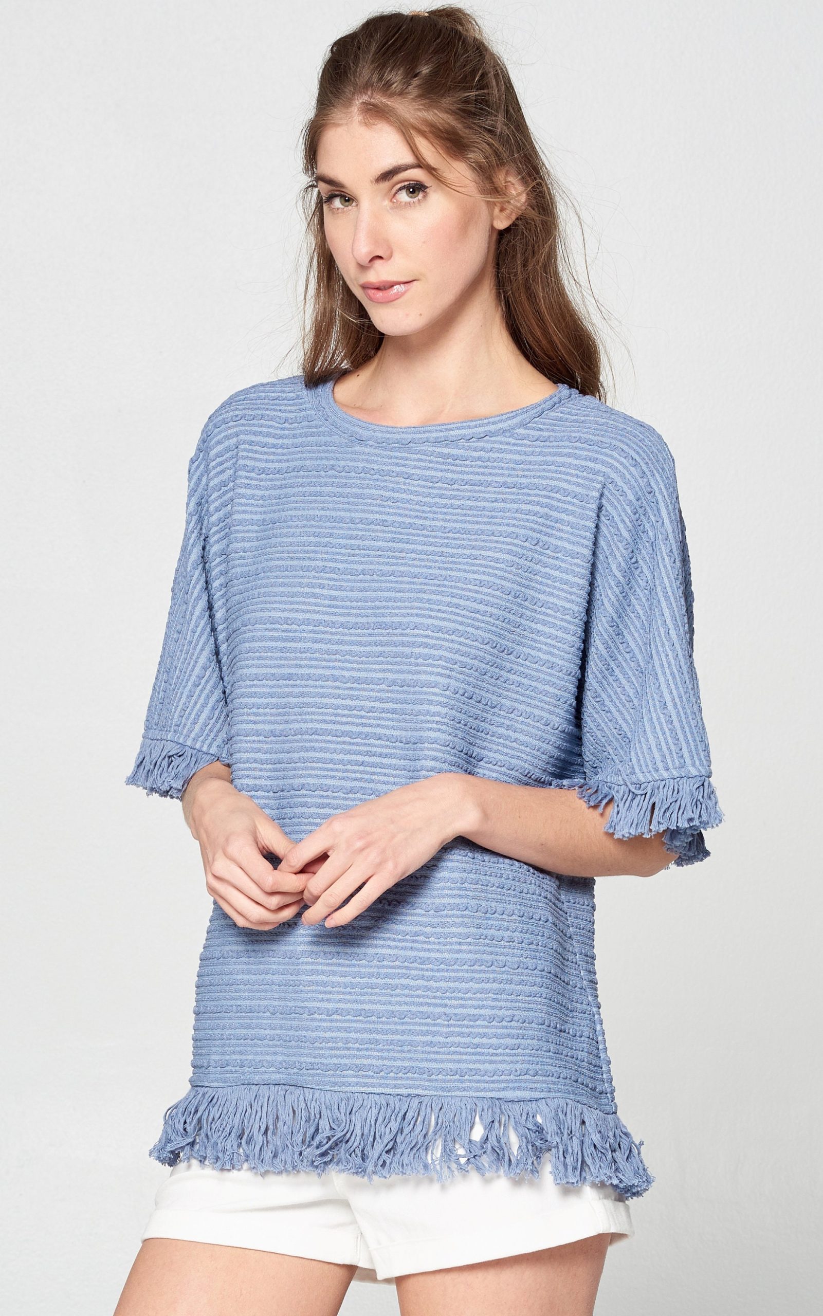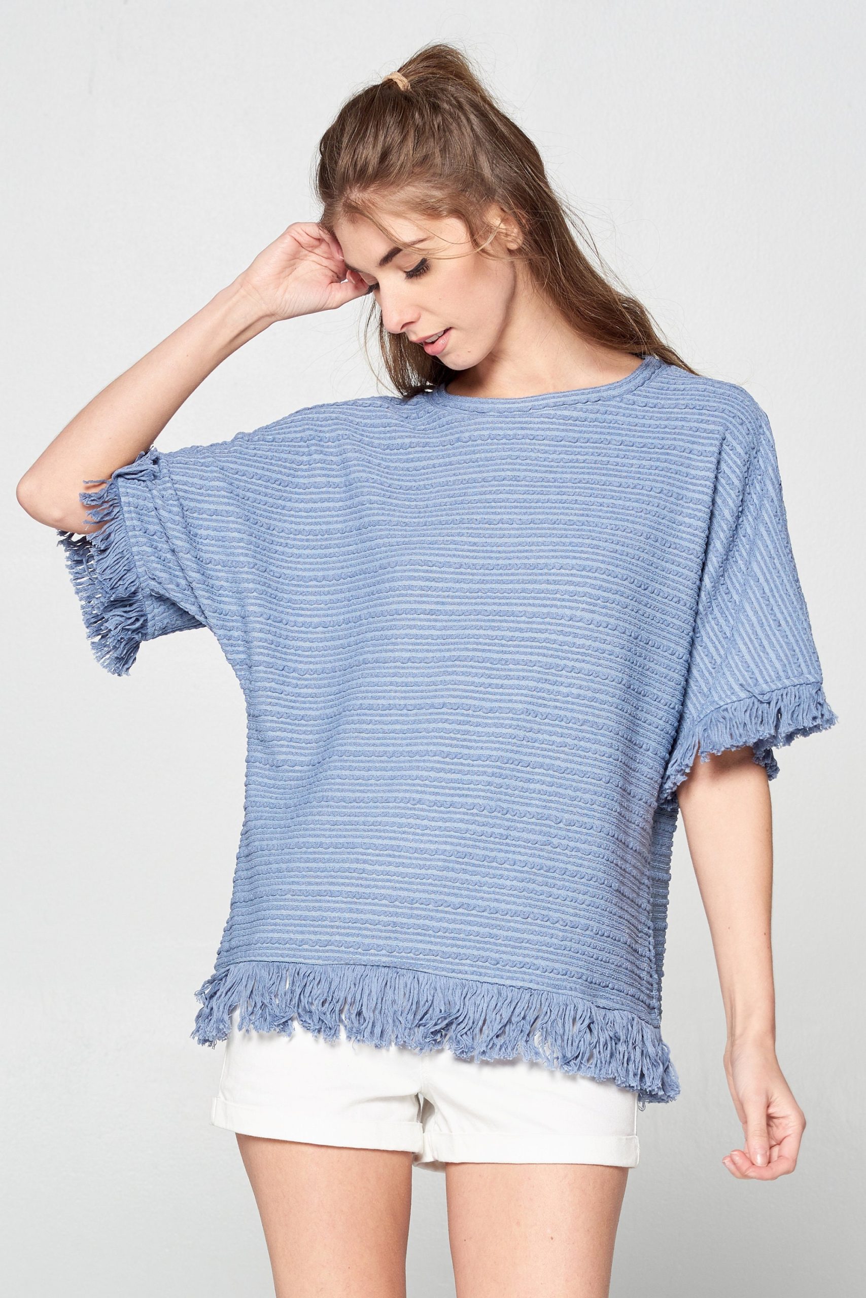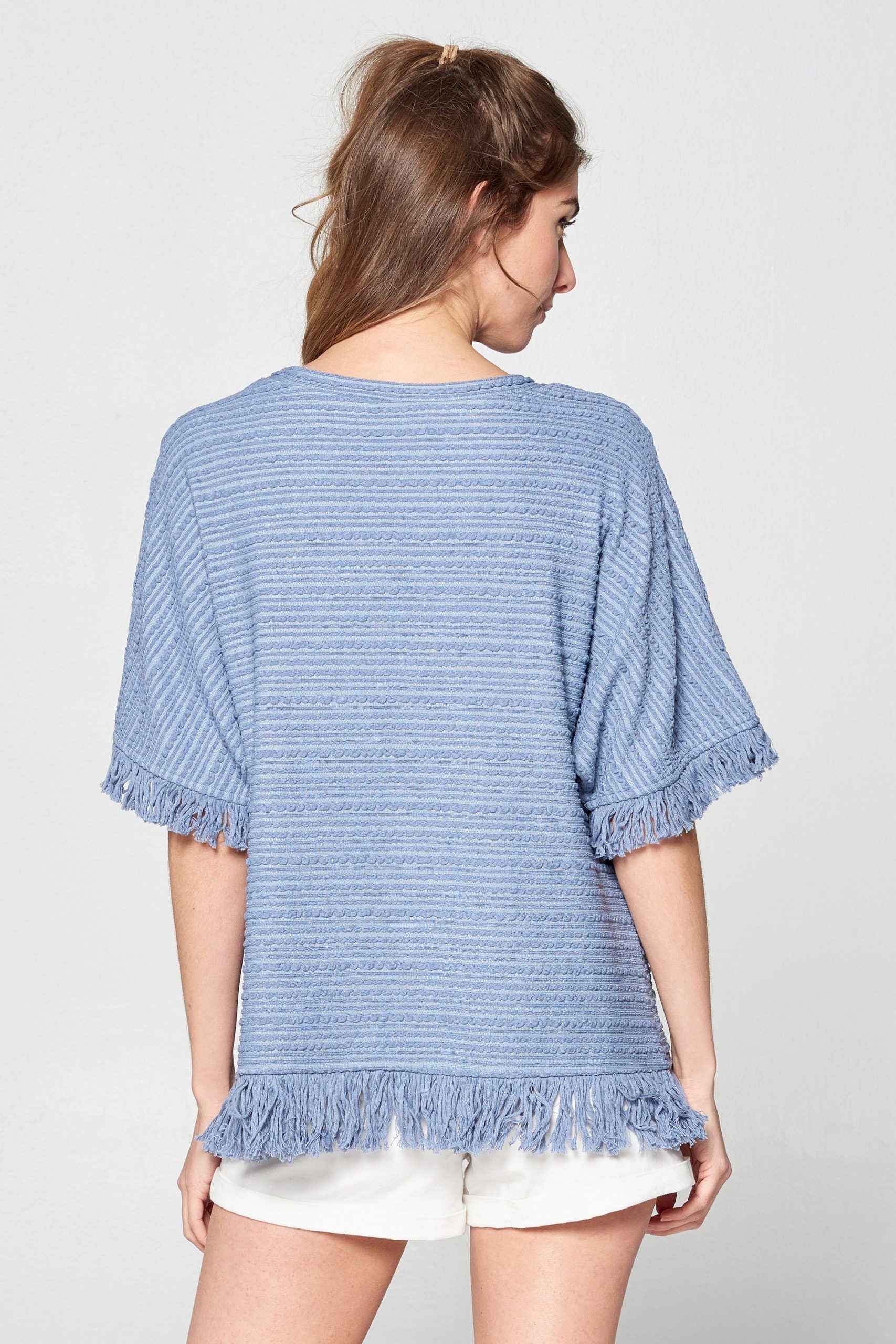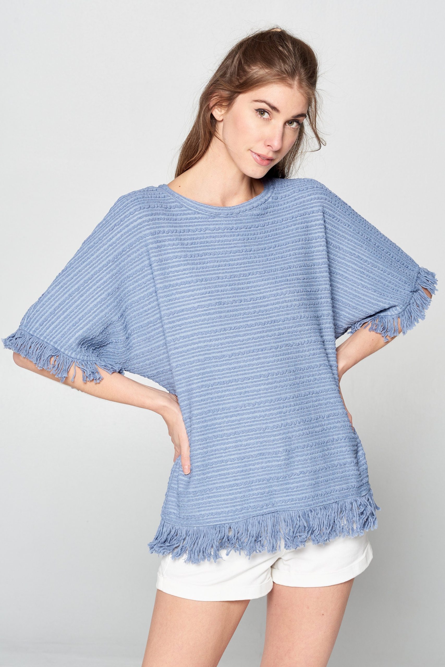 Super comfy textured-knit casual top featured with fringe details