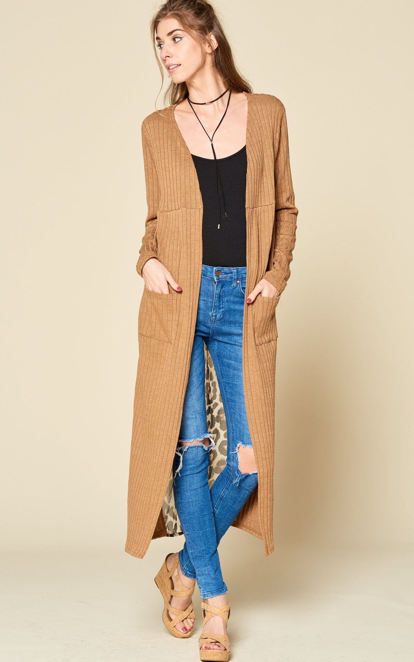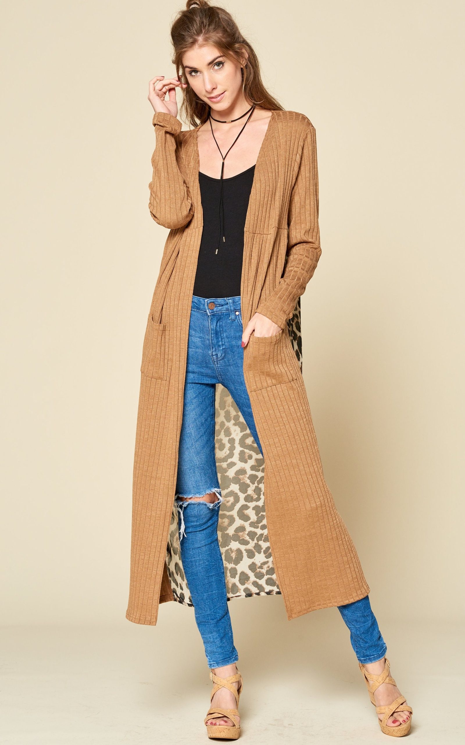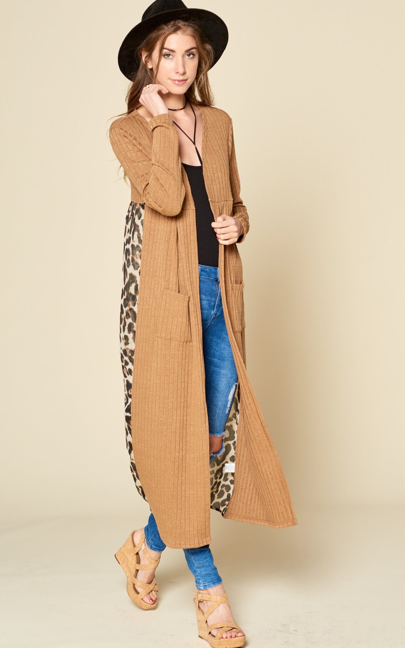 Open front, long sleeved maxi cardigan with back leopard chiffon contrast.