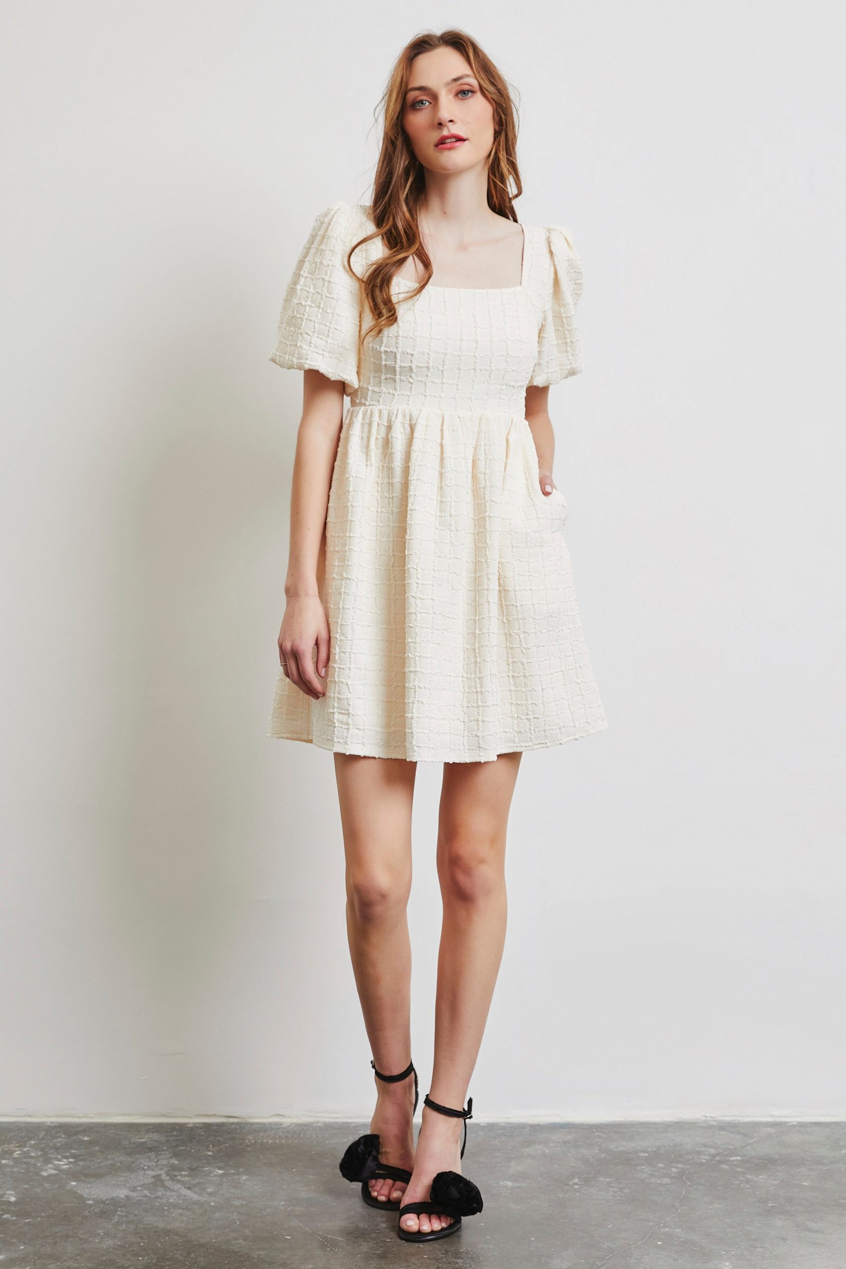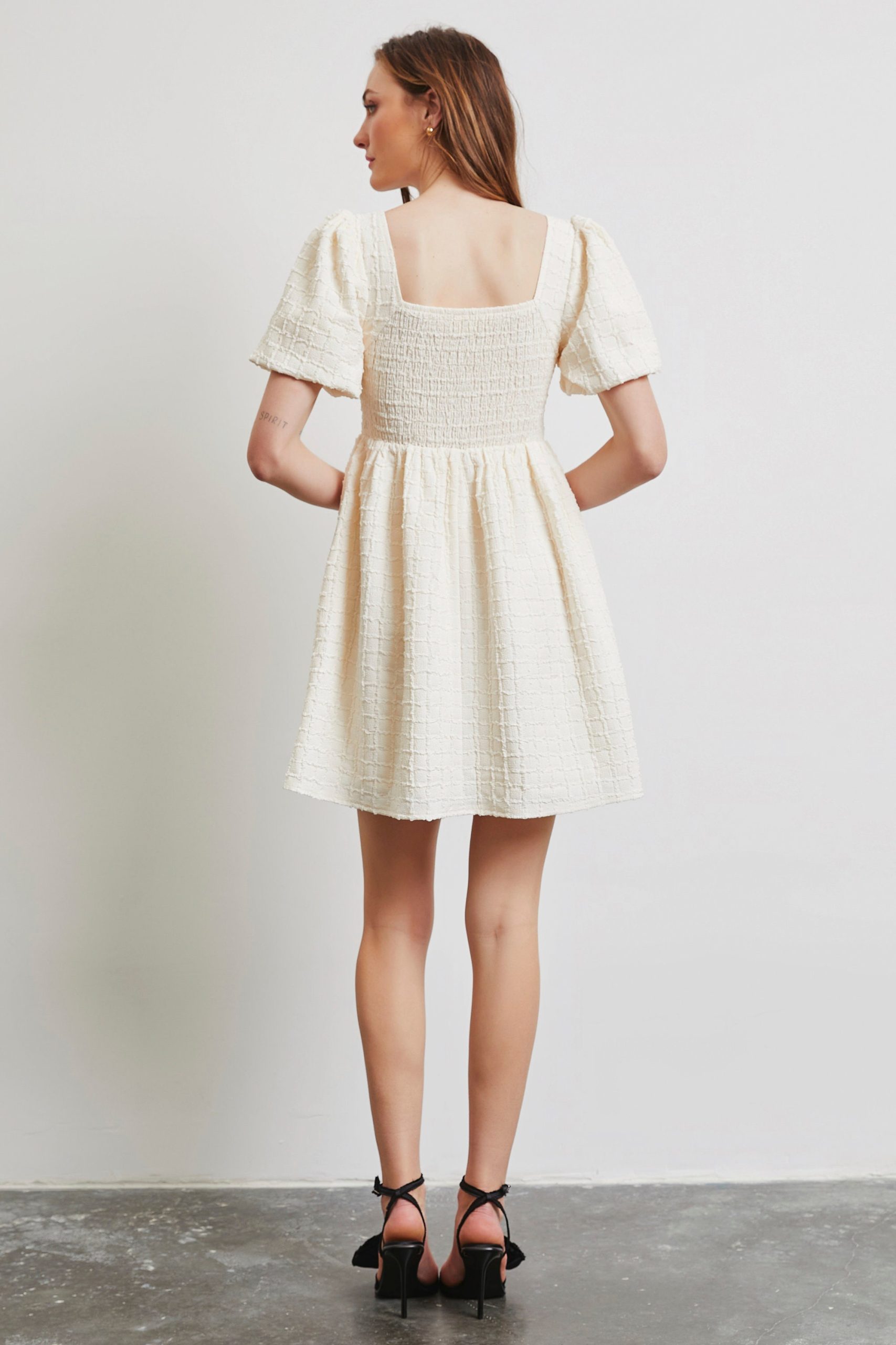 Be the first to review “Textured Mini Dress Square Neck Bubble Sleeve Smocked”